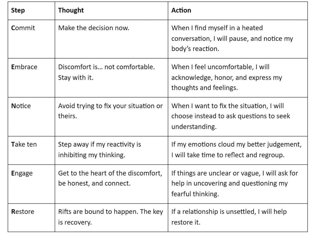 The following are six practical steps to navigating difficult conversations. Remember to CENTER: